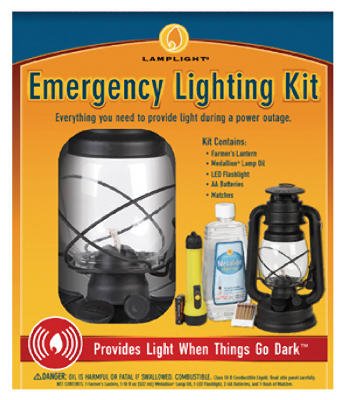- Contains: farmer's lantern, 18-ounce clear medallion, led flashlight, 2-aa batteries, book of matches