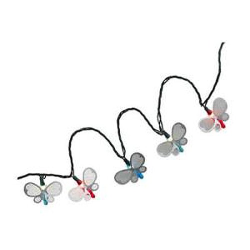 Four Seasons Courtyard, 10 Light Metal Butterfly String Light Set, Red, Blue, Cyan Body With Silver Wings, With 10 Mini Bulbs Included. Overall Wire Length 112", Green Cord. Lead In 12", Bulb Spacing 10", Lead Out 10". Indoor and Outdoor Use, With End Outlet. Four Spare Bulbs and One Spare Fuse Included. Ulf Listed. Packaged In Clear Acetate Box.