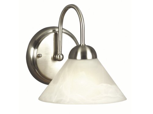 Finish:Brushed Steel, Light Bulb:(1)60w A15 Med F Incand This one light wall sconce displays a cosmopolitan look with a simple design. It features an alabaster glass, cone-shaped diffuser and is finished in brushed steel. This fixture can be mounted with the glass up or down and will complement any updated decor.